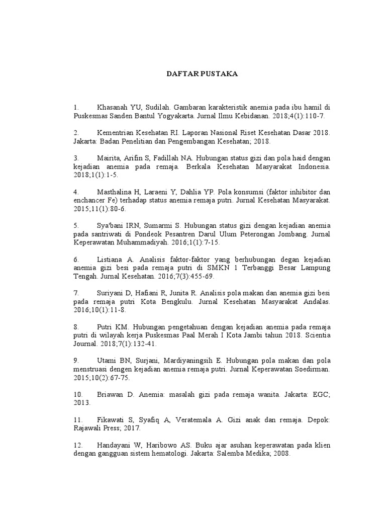 Daftar Pustaka آ Anemia Gizi Besi Pada Remaja Putri Di Smkn 1 Terbanggi Besar Lampung Pdf Document from static.fdokumen.com Kesmas jurnal kesehatan masyarakat nasional fakultas kesehatan masyarakat universitas table_row row_columnsumardiyono. Faktor risiko yang berhubungan dengan kejadian anemia pada remaja putri. Hasil penelitian tersebut menunjukkan 84,4% remaja putri yang berpengetahuan rendah mengalami anemia. Jurnal tentang anemia pada ibu hamil pdf. Prevalensi anemia pada remaja putri di kota bogor yakni 20.9% (36/172). Anemia merupakan salah satu masalah kesehatan utama masyarakat di negara berkembang. Prevalensi anemia pada remaja tahun Anemia juga mempengaruhi prestasi belajar karena remaja putri yang mengalami anemia akan berdampak pada